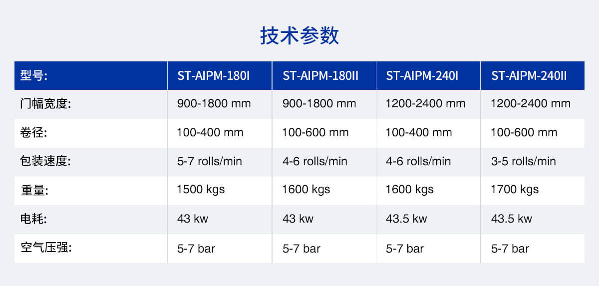 门幅尺寸范围 :900-1800mm/1200-2400mm 布卷直径范围:100-400mm/100-600mm 包装速度:5-7卷/分钟、4-6卷/分钟、3-5卷/分钟 电耗(千瓦): 43 空气压强: 5-7(bar) |